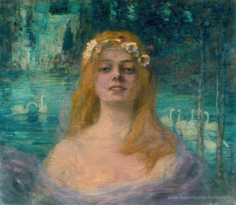 Nous vous proposons une reproduction artisanale sur toile du célèbre tableau 'La fée du lac' de Kimon Loghi, provenant du Musée de la Reproduction.