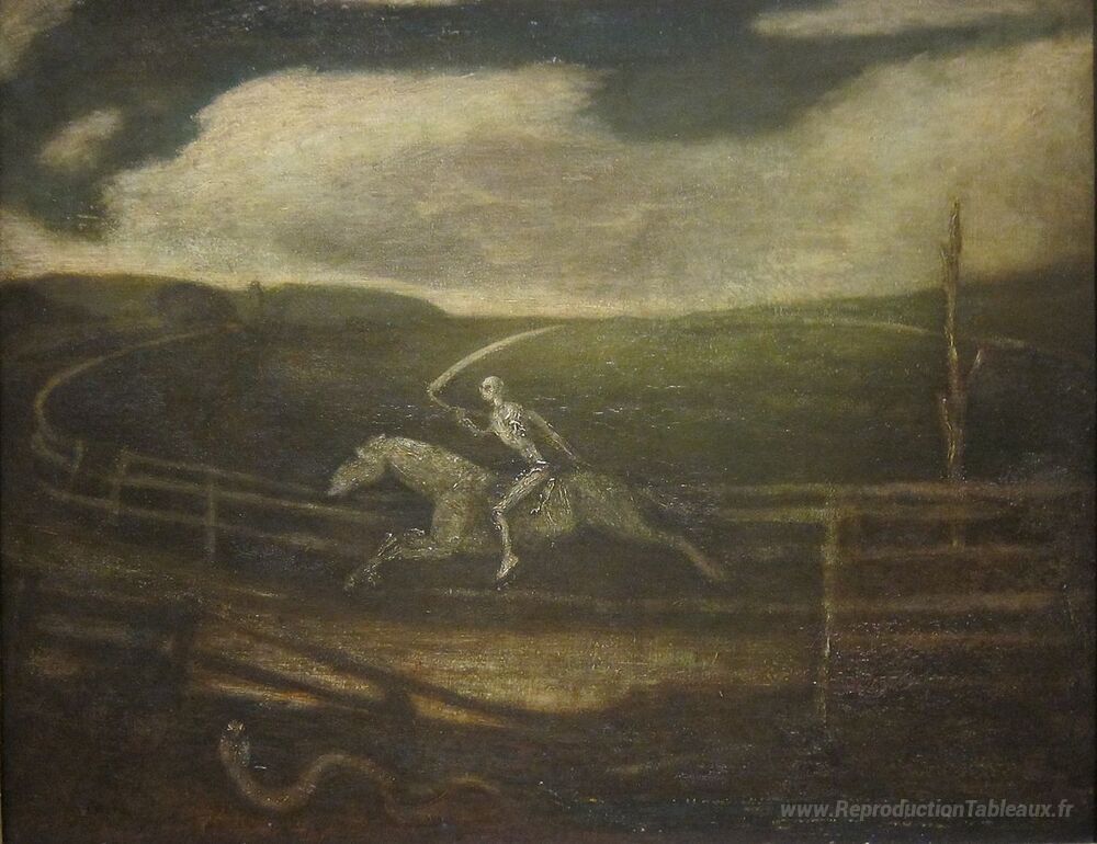 Nous vous proposons une reproduction artisanale sur toile du célèbre tableau 'La piste de course (mort sur un cheval pâle)' de Albert Pinkham Ryder, provenant du Musée de la Reproduction.