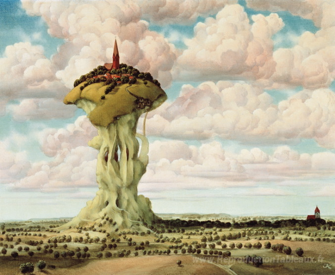 Nous vous proposons une reproduction artisanale sur toile du célèbre tableau 'La vie sur le moignon' de Jacek Yerka, provenant du Musée de la Reproduction.
