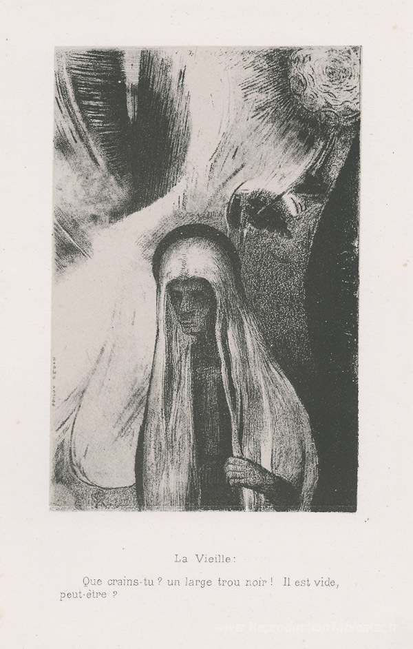 Nous vous proposons une reproduction artisanale sur toile du célèbre tableau 'La vieille femme: De quoi avez-vous peur? Un large trou noir! C'' de Odilon Redon, provenant du Musée de la Reproduction.