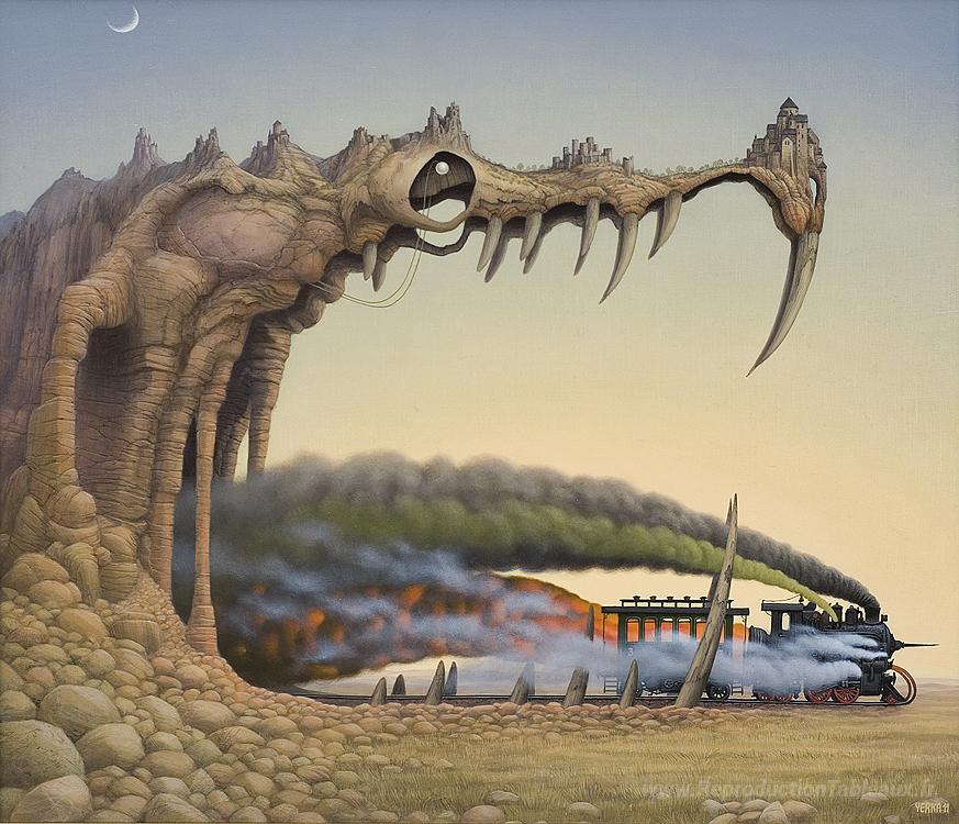 Nous vous proposons une reproduction artisanale sur toile du célèbre tableau 'Le plaisir du dragon' de Jacek Yerka, provenant du Musée de la Reproduction.