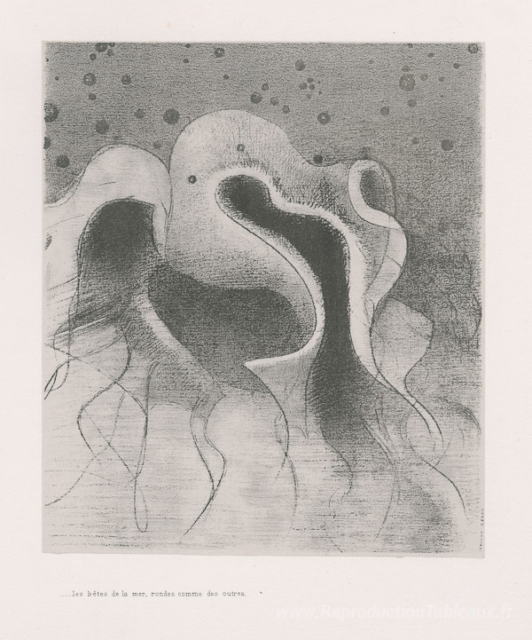 Nous vous proposons une reproduction artisanale sur toile du célèbre tableau 'Les bêtes de la mer, rondes comme des bouteilles en cuir (planch' de Odilon Redon, provenant du Musée de la Reproduction.