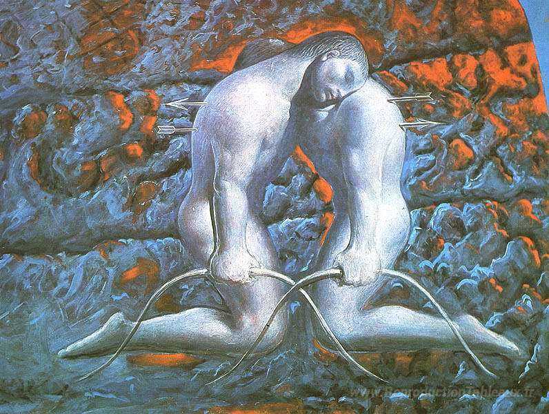 Nous vous proposons une reproduction artisanale sur toile du célèbre tableau 'Les guerriers' de Sabin Balasa, provenant du Musée de la Reproduction.