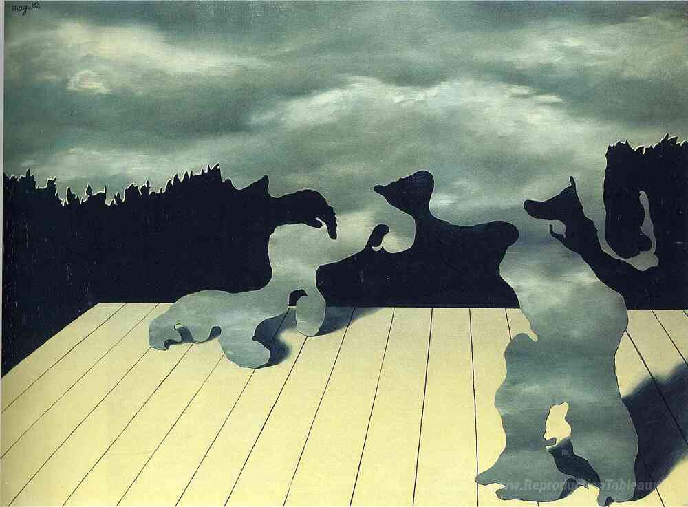Nous vous proposons une reproduction artisanale sur toile du célèbre tableau 'Les muscles du ciel' de Rene Magritte, provenant du Musée de la Reproduction.