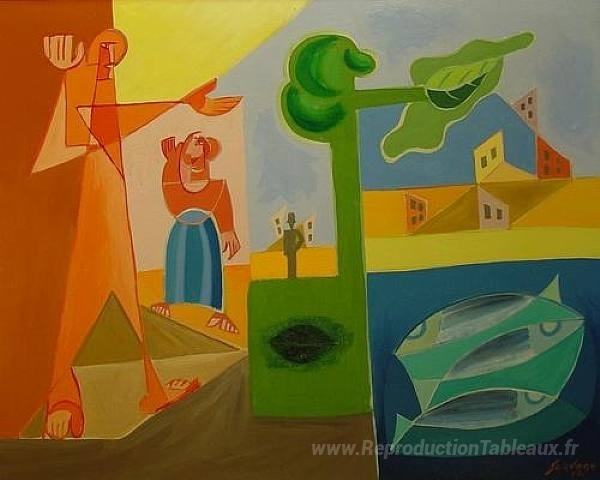 Nous vous proposons une reproduction artisanale sur toile du célèbre tableau 'Les Présences' de Leopold Survage, provenant du Musée de la Reproduction.