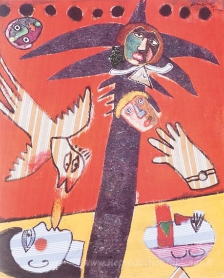 Nous vous proposons une reproduction artisanale sur toile du célèbre tableau 'L'Heure du Matelas (collaboration avec Corneille)' de Enrico Baj, provenant du Musée de la Reproduction.