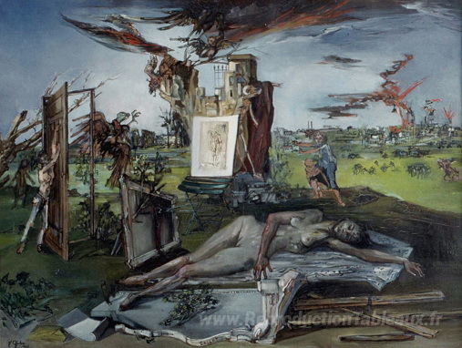 Nous vous proposons une reproduction artisanale sur toile du célèbre tableau 'L'hommage à Callot' de Francis Gruber, provenant du Musée de la Reproduction.