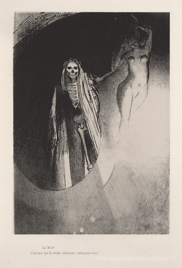 Nous vous proposons une reproduction artisanale sur toile du célèbre tableau 'Mort: C'est moi qui vous rend sérieux; nous embrassons (planche ' de Odilon Redon, provenant du Musée de la Reproduction.