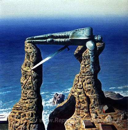 Nous vous proposons une reproduction artisanale sur toile du célèbre tableau 'Moyen Âge permanent' de Sabin Balasa, provenant du Musée de la Reproduction.