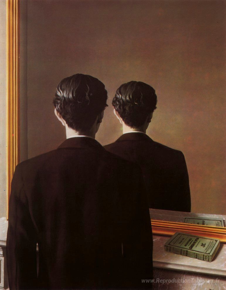 Nous vous proposons une reproduction artisanale sur toile du célèbre tableau 'Ne pas être reproduit' de Rene Magritte, provenant du Musée de la Reproduction.