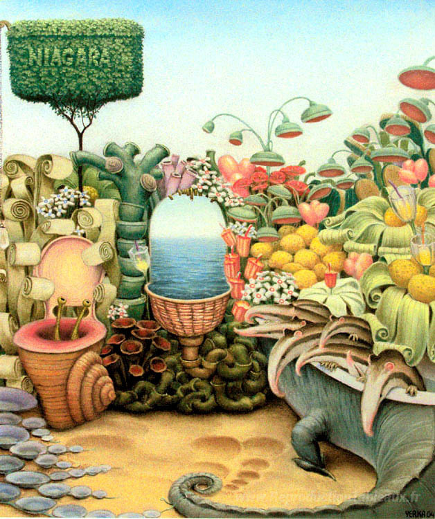 Nous vous proposons une reproduction artisanale sur toile du célèbre tableau 'Niagara' de Jacek Yerka, provenant du Musée de la Reproduction.