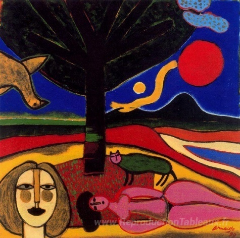 Nous vous proposons une reproduction artisanale sur toile du célèbre tableau 'Paradis, paradis' de Corneille, provenant du Musée de la Reproduction.