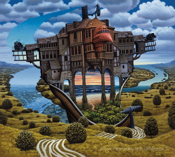 Nous vous proposons une reproduction artisanale sur toile du célèbre tableau 'Paysage ciselier' de Jacek Yerka, provenant du Musée de la Reproduction.