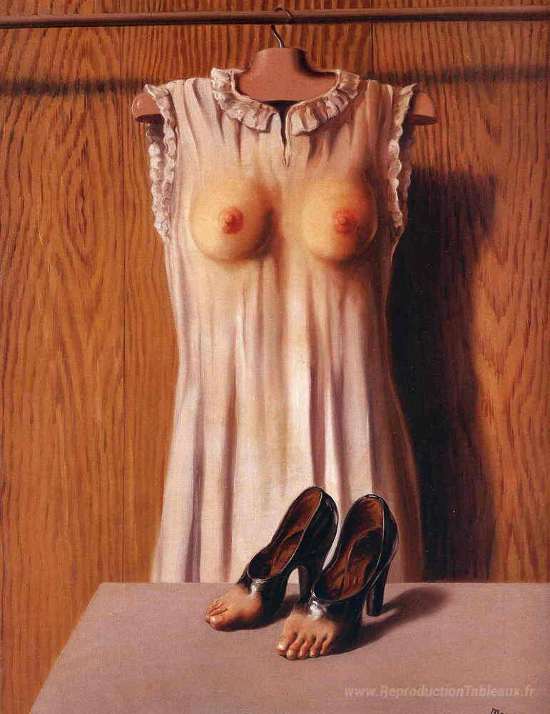 Nous vous proposons une reproduction artisanale sur toile du célèbre tableau 'Philosophie dans la chambre' de Rene Magritte, provenant du Musée de la Reproduction.
