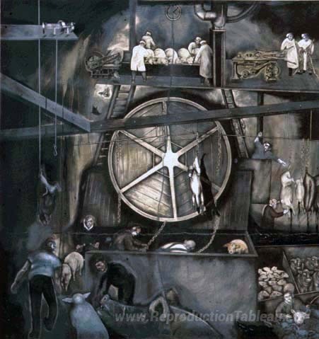 Nous vous proposons une reproduction artisanale sur toile du célèbre tableau 'Roue' de Sue Coe, provenant du Musée de la Reproduction.