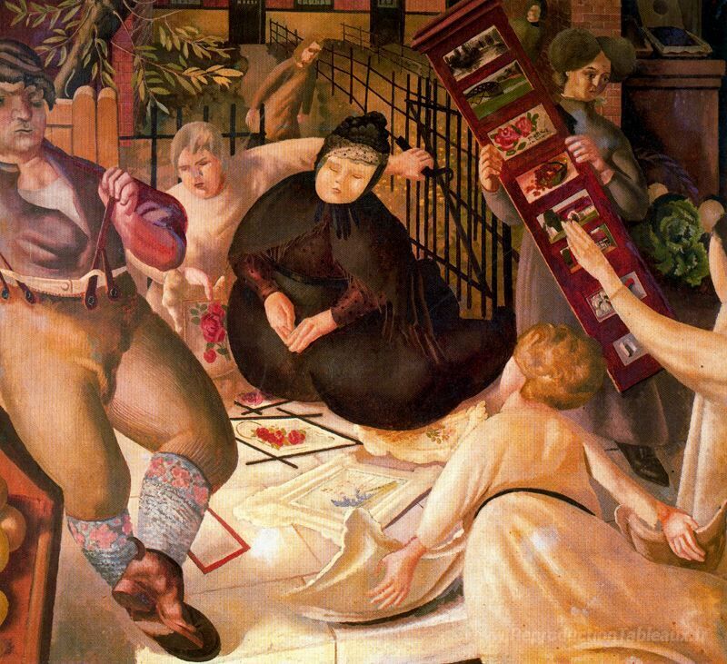 Nous vous proposons une reproduction artisanale sur toile du célèbre tableau 'Sarah Tubb et les visiteurs célestes' de Stanley Spencer, provenant du Musée de la Reproduction.