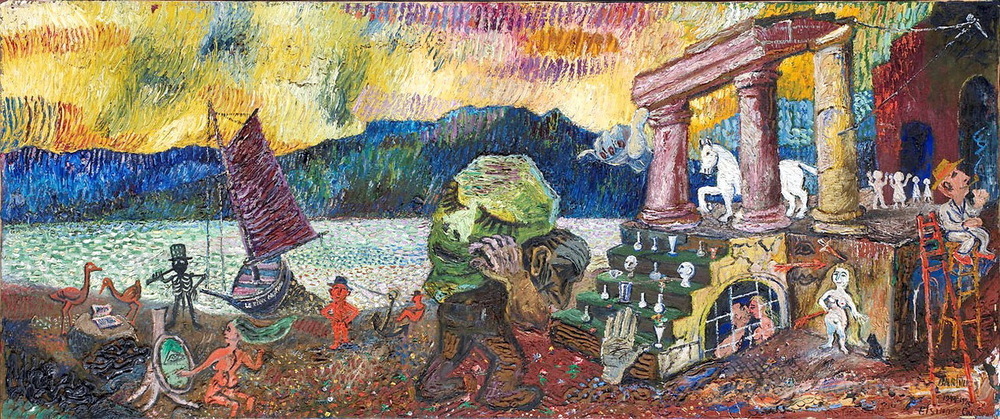 Nous vous proposons une reproduction artisanale sur toile du célèbre tableau 'Scène mythologique' de David Burliuk, provenant du Musée de la Reproduction.