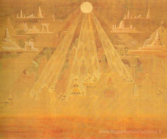 Nous vous proposons une reproduction artisanale sur toile du célèbre tableau 'Scherzo (sonate des pyramides)' de Mikalojus Ciurlionis, provenant du Musée de la Reproduction.
