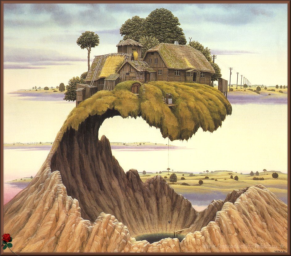 Nous vous proposons une reproduction artisanale sur toile du célèbre tableau 'S'il vous plaît ne claquez pas la porte' de Jacek Yerka, provenant du Musée de la Reproduction.