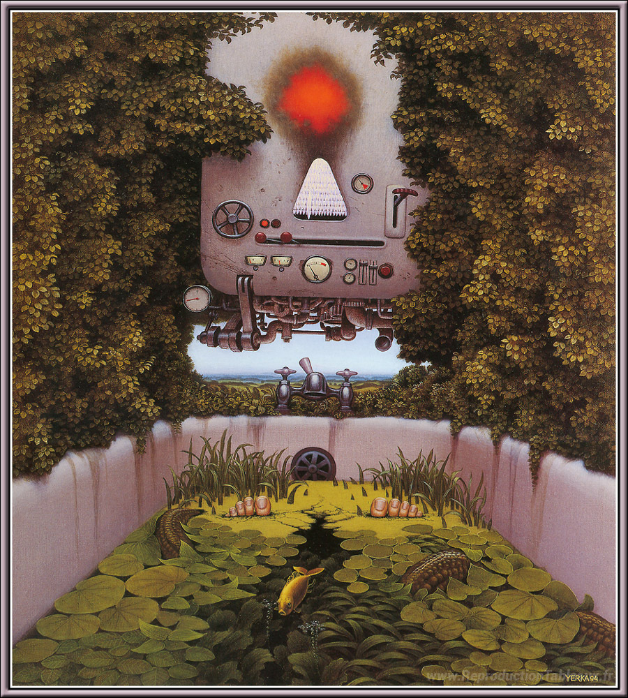 Nous vous proposons une reproduction artisanale sur toile du célèbre tableau 'Temps de relaxation' de Jacek Yerka, provenant du Musée de la Reproduction.