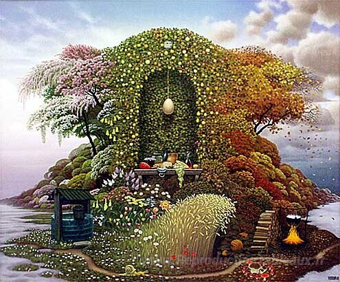 Nous vous proposons une reproduction artisanale sur toile du célèbre tableau 'Trois saisons' de Jacek Yerka, provenant du Musée de la Reproduction.
