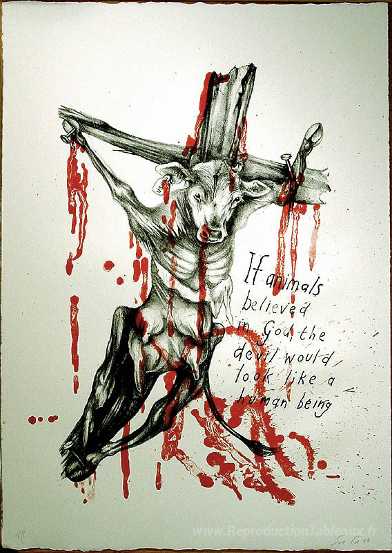 Nous vous proposons une reproduction artisanale sur toile du célèbre tableau 'Vache tif' de Sue Coe, provenant du Musée de la Reproduction.