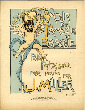 Nous vous proposons une reproduction artisanale sur toile du célèbre tableau 'Amour et Tambour de Basque' de Theophile Steinlen, provenant du Musée de la Reproduction.