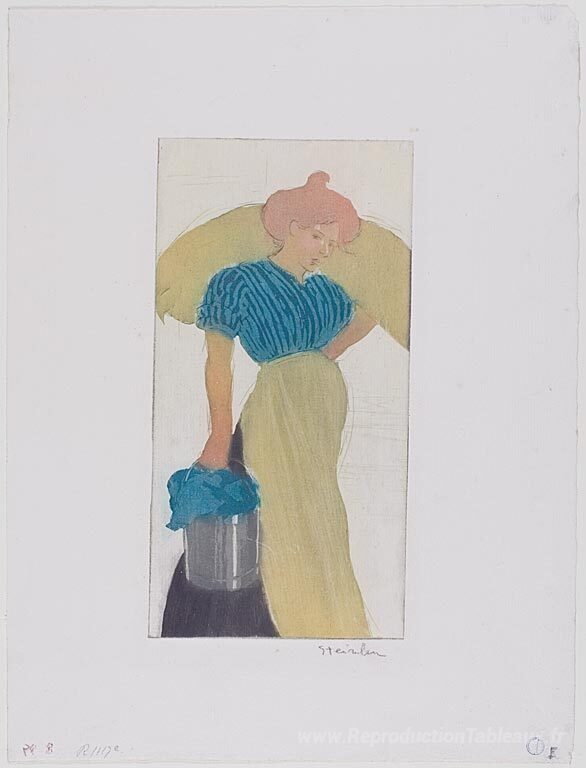 Nous vous proposons une reproduction artisanale sur toile du célèbre tableau 'Blanchisseuse' de Theophile Steinlen, provenant du Musée de la Reproduction.