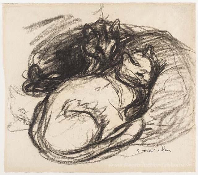 Nous vous proposons une reproduction artisanale sur toile du célèbre tableau 'Chats' de Theophile Steinlen, provenant du Musée de la Reproduction.