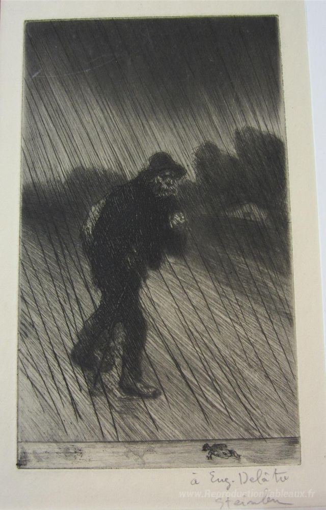 Nous vous proposons une reproduction artisanale sur toile du célèbre tableau 'Cheminau Sous la Pluie' de Theophile Steinlen, provenant du Musée de la Reproduction.