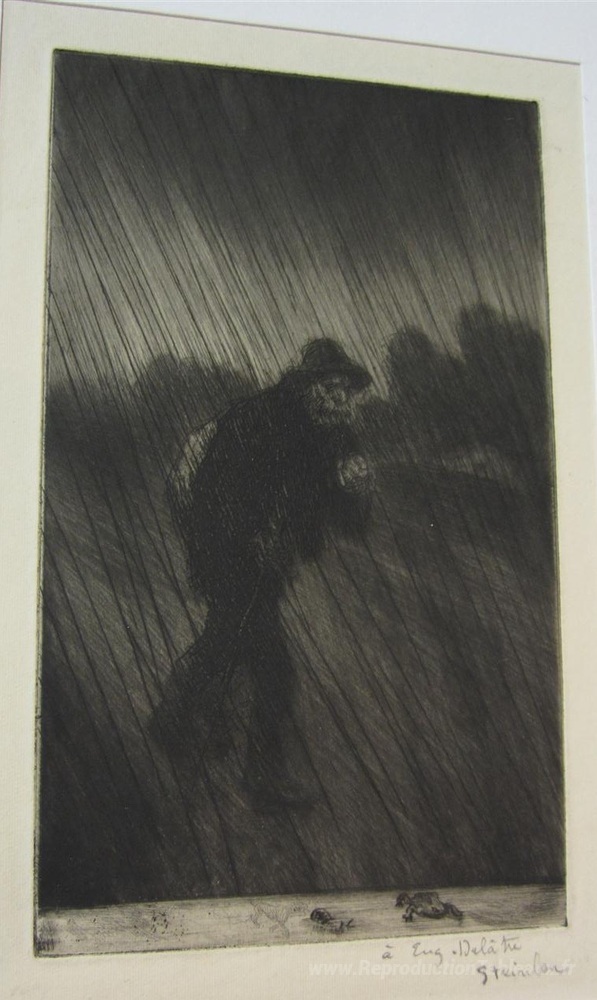 Nous vous proposons une reproduction artisanale sur toile du célèbre tableau 'Cheminau Sous la Pluie' de Theophile Steinlen, provenant du Musée de la Reproduction.