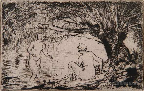 Nous vous proposons une reproduction artisanale sur toile du célèbre tableau 'Deux baignueus' de Theophile Steinlen, provenant du Musée de la Reproduction.