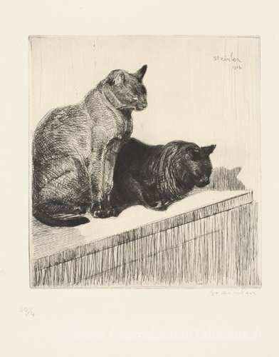 Nous vous proposons une reproduction artisanale sur toile du célèbre tableau 'Deux chats assis' de Theophile Steinlen, provenant du Musée de la Reproduction.