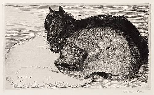 Nous vous proposons une reproduction artisanale sur toile du célèbre tableau 'Deux chats endormis' de Theophile Steinlen, provenant du Musée de la Reproduction.