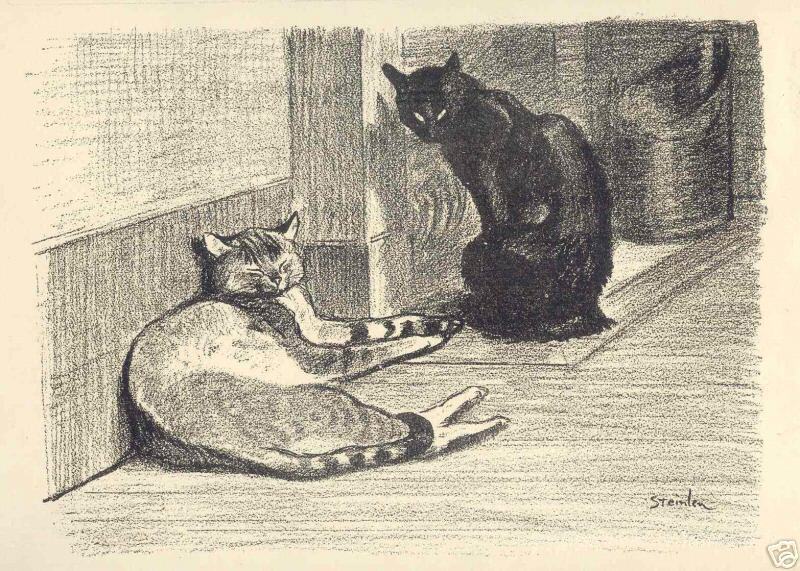 Nous vous proposons une reproduction artisanale sur toile du célèbre tableau 'Deux chats' de Theophile Steinlen, provenant du Musée de la Reproduction.