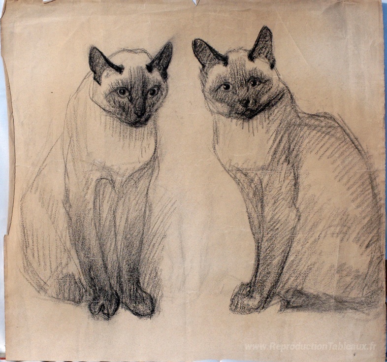 Nous vous proposons une reproduction artisanale sur toile du célèbre tableau 'Deux chats siamois' de Theophile Steinlen, provenant du Musée de la Reproduction.