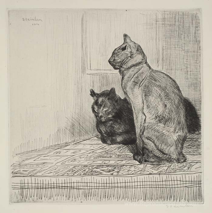Nous vous proposons une reproduction artisanale sur toile du célèbre tableau 'Deux chats sur une armoire' de Theophile Steinlen, provenant du Musée de la Reproduction.