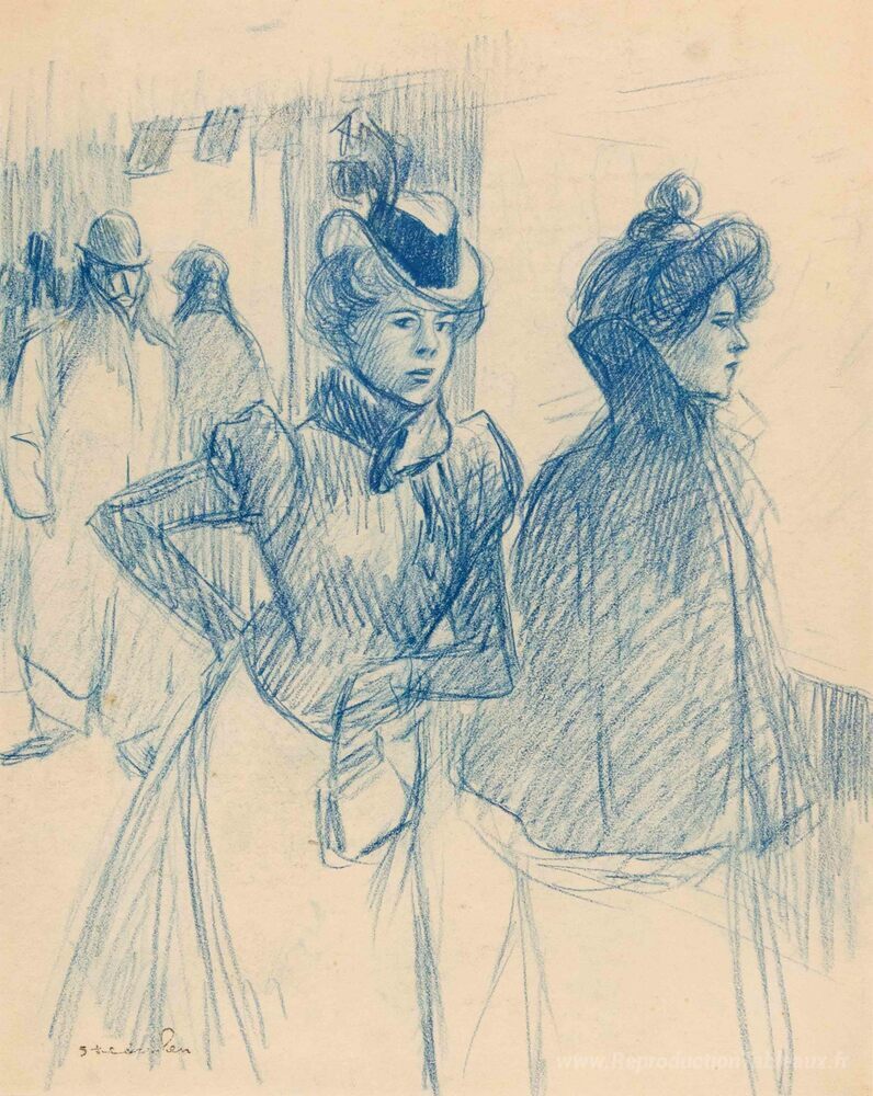Nous vous proposons une reproduction artisanale sur toile du célèbre tableau 'Deux femmes élégantes' de Theophile Steinlen, provenant du Musée de la Reproduction.