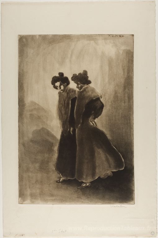 Nous vous proposons une reproduction artisanale sur toile du célèbre tableau 'Deux Femmes' de Theophile Steinlen, provenant du Musée de la Reproduction.
