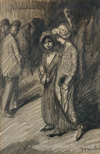 Nous vous proposons une reproduction artisanale sur toile du célèbre tableau 'Deux Jeunes remplit le promenseur' de Theophile Steinlen, provenant du Musée de la Reproduction.