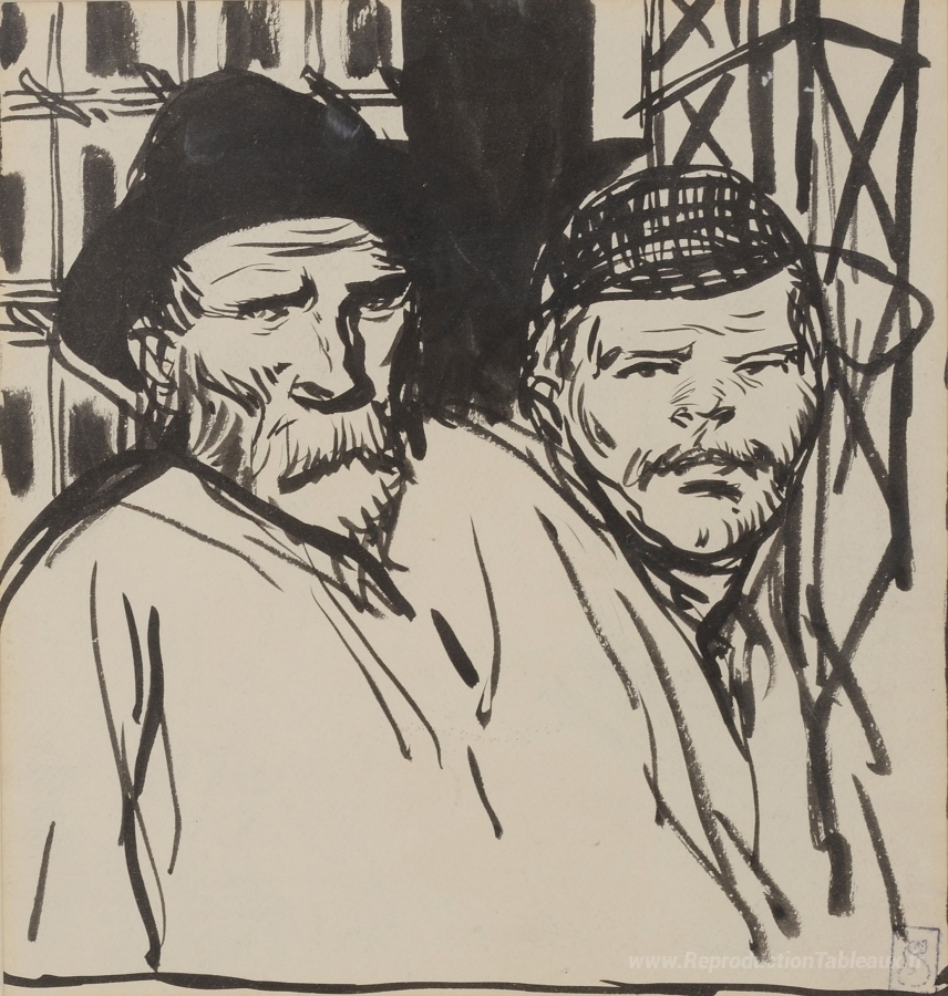 Nous vous proposons une reproduction artisanale sur toile du célèbre tableau 'Deux Ouvriers' de Theophile Steinlen, provenant du Musée de la Reproduction.