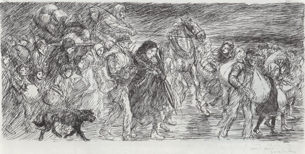 Nous vous proposons une reproduction artisanale sur toile du célèbre tableau 'Exode - en longéur' de Theophile Steinlen, provenant du Musée de la Reproduction.