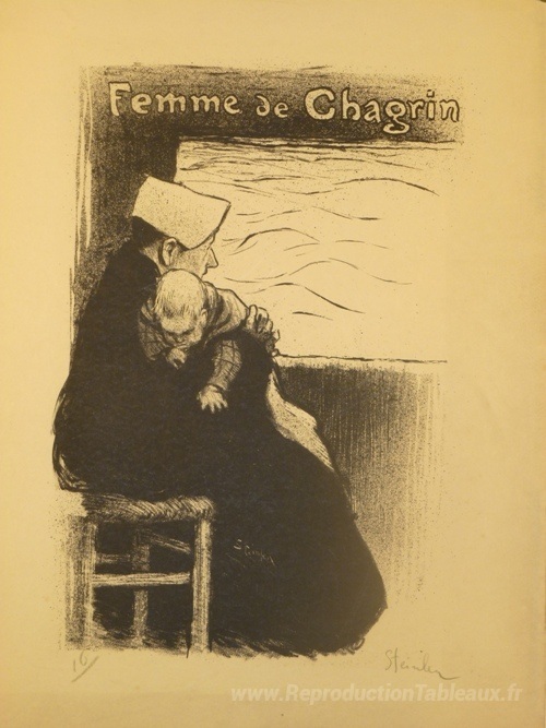 Nous vous proposons une reproduction artisanale sur toile du célèbre tableau 'Femme de Chagrin' de Theophile Steinlen, provenant du Musée de la Reproduction.
