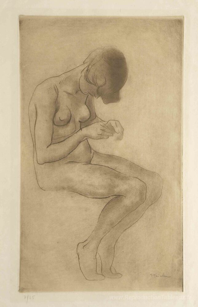 Nous vous proposons une reproduction artisanale sur toile du célèbre tableau 'Femme faisant des ongles' de Theophile Steinlen, provenant du Musée de la Reproduction.