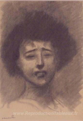 Nous vous proposons une reproduction artisanale sur toile du célèbre tableau 'Femme triste' de Theophile Steinlen, provenant du Musée de la Reproduction.