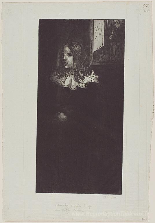 Nous vous proposons une reproduction artisanale sur toile du célèbre tableau 'FILETTE AU COL BLANC' de Theophile Steinlen, provenant du Musée de la Reproduction.