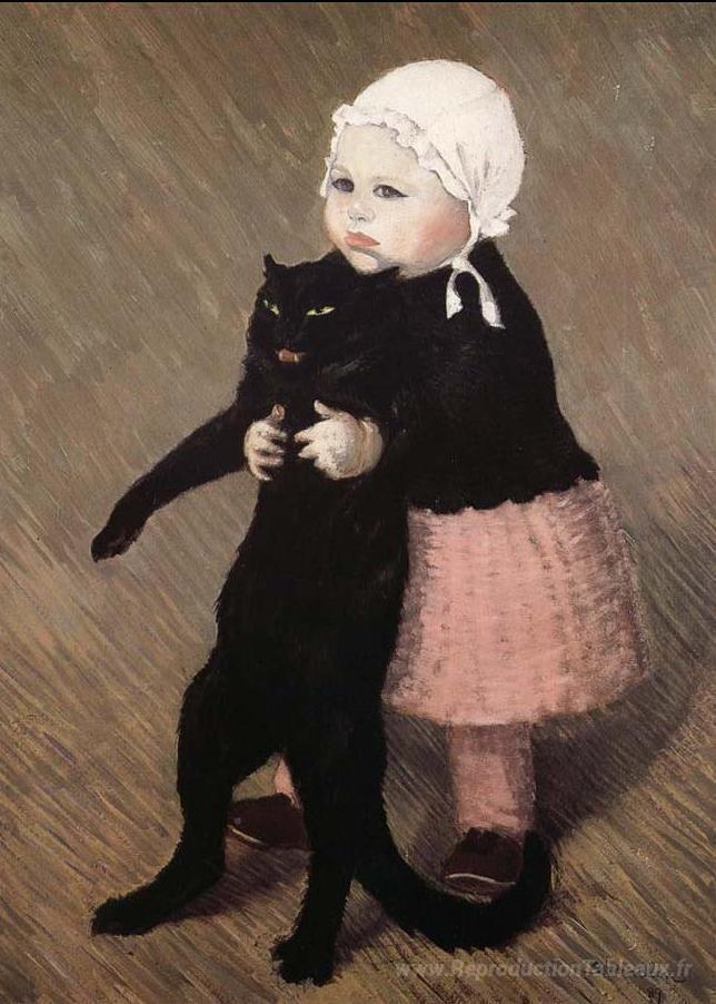 Nous vous proposons une reproduction artisanale sur toile du célèbre tableau 'Fille avec chat' de Theophile Steinlen, provenant du Musée de la Reproduction.