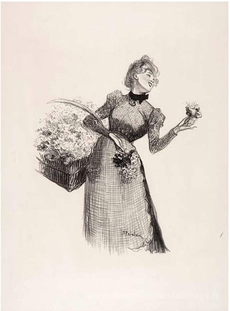 Nous vous proposons une reproduction artisanale sur toile du célèbre tableau 'Fleuriste' de Theophile Steinlen, provenant du Musée de la Reproduction.