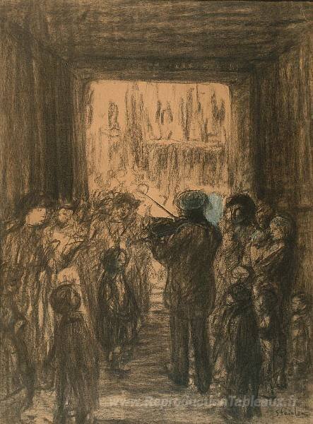 Nous vous proposons une reproduction artisanale sur toile du célèbre tableau 'Foule écoutant Fiddler' de Theophile Steinlen, provenant du Musée de la Reproduction.