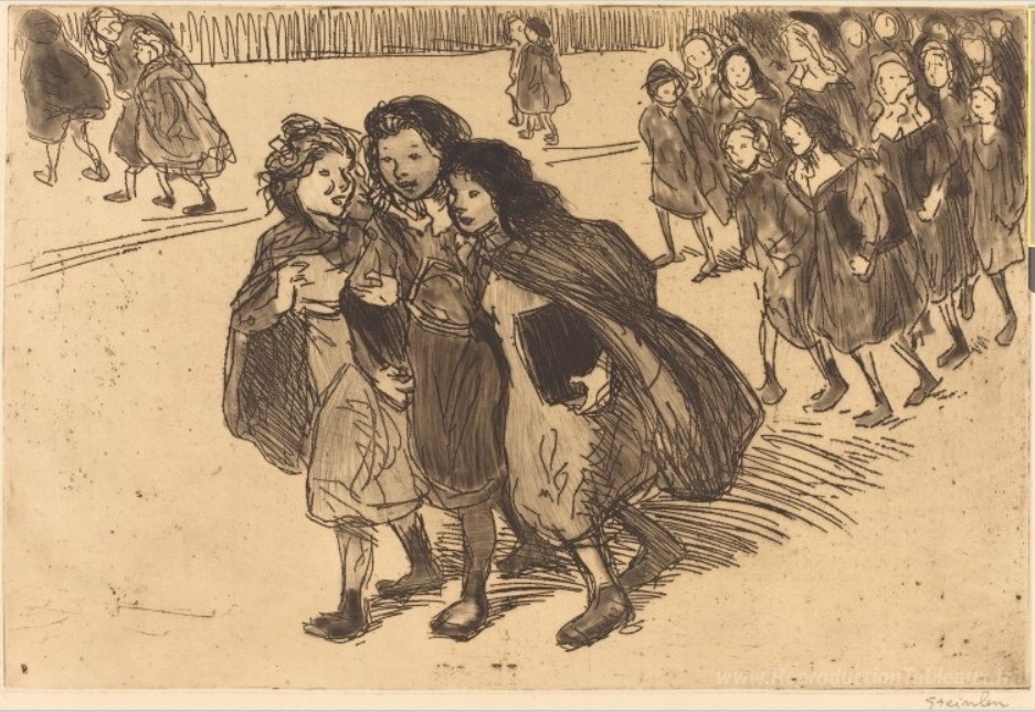 Nous vous proposons une reproduction artisanale sur toile du célèbre tableau 'Gamines Sortant de L'Ecole' de Theophile Steinlen, provenant du Musée de la Reproduction.